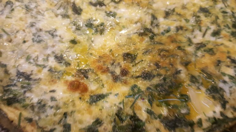 Kaurdisim në një tigan me gjalpë dhe vaj ulliri qepën e thatë dhe qepën e njomë të grirë imët. Shtojmë pak kripë dhe piper dhe pasi qepët të zbuten mirë shtojmë majdanozin dhe koperën e grirë hollë.