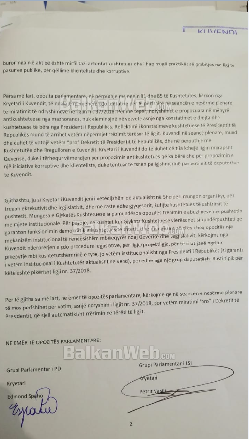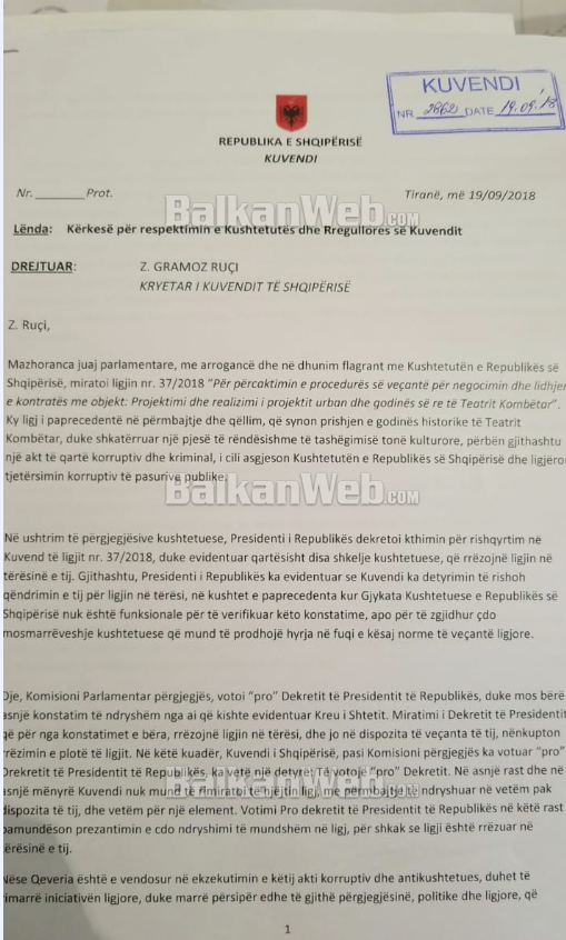 Gjithashtu ju si Kryetar i Kuvendit jeni i vetëdijshëm që aktualisht në Shqipëri mungon organi kyç që i tregon ekzekutivit dhe legjislativit dhe me raste dhe gjyqësorit, kufijtë kushtetues të ushtrimit të pushtetit. Mungesa e Gjykatës Kushtetuese ia pamundëson opozitës frenimin e abuzimeve me pushtetin me mjete institucionale. Për pasojë, në kushtet kur Gjykata Kushtetuese vlerësohet si kundërpushteti që garanton funksionimin demokratik e kushtetues të shtetit, dhe mungesa e së cilës i heq opozitës një mekanizëm institucional të rëndësishëm mbikëqyrës ndaj qeverisë dhe legjislativit, kërkojmë nga Kuvendi ndërprerjen e çdo procedure legjislative, për ligje/projektligje, për të cilat janë ngritur pikëpyetje mbi kushtetueshmërinë e tyre, jo vetëm institucionalisht nga Presidenti i Republikës (si garanti i vetëm institucional i Kushtetutës aktualisht në vend), por edhe nga një grup deputetësh. Rasti tipik për këtë është pikërisht ligji nr. 37/2018.
