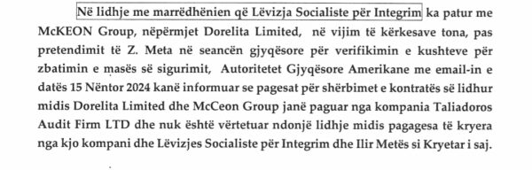 “Në lidhje me marrëdhënien që Lëvizja Socialiste për Integrim ka patur me “McKEON Group”, nëpërmjet “Dorelita Limited”, në vijim të kërkesave tona, pas pretendimit të Z. Meta në seancën gjyqësore për verifikimin e kushteve për zbatimin e masës së sigurimit, Autoritetet Gjyqësore Amerikane me email-in e datës 15 Nentor 2024 kanë informuar se pagesat për shërbimet e kontratës së lidhur midis “Dorelita Limited” dhe “McCeon Group” janë paguar nga kompania “Taliadoros Audit Firm LTD” dhe nuk është vërtetuar ndonjë lidhje midis pagesava të kryera nga kjo kompani dhe Lëvizjes Socialiste për Integrim dhe Ilir Metës si Kryetar i saj”