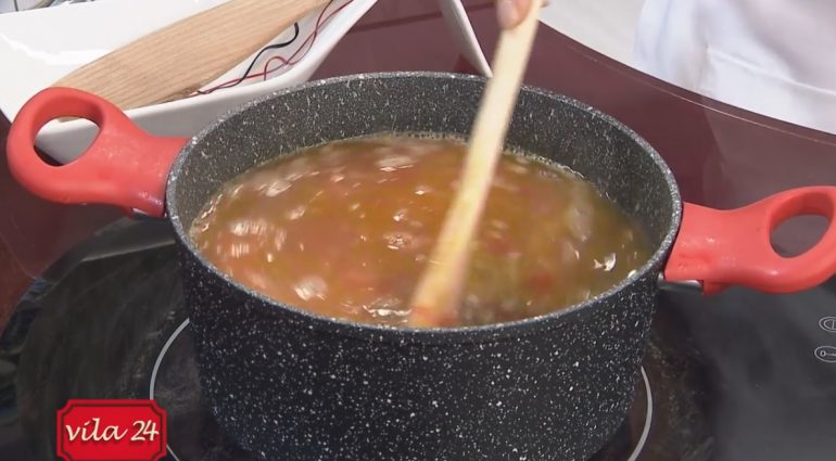 Më pas hedhim thjerrëzat, i përziejmë dy-tre herë, shtojmë më pas domaten dhe vazhdojmë kaurdisjen dhe për 2 minuta të tjera. Në fund shtojmë ujë të ngrohtë sa 3/4 e masës (mund të përdorim dhe buljon me një koncentrat pule). I lemë thjerrëzat të ziejnë për 20 minuta dhe më pas shtojmë dhe makaronat.