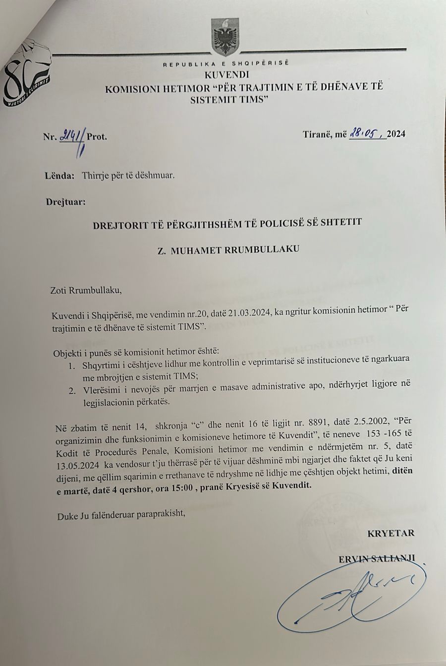 Në komisionin hetimor parlamentar për TIMS në datën 4 qershor do të dëshmojnë ministri i Brendshëm, Taulant Balla, Drejtori i Përgjithshëm i Policisë së Shtetit, Muhamet Rrumbullaku, si dhe Ervin Muça, ish-drejtori i IT në Policinë e Shtetit, i cili ndodhet në arrest shtëpie, pas hetimeve të Prokurorisë lidhur me ndërhyrjet në këtë sistem.