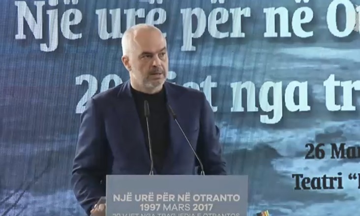 “Të gjithëve ju t’ju shpreh mirënjohjen më të thellë, por dhe kryetarit të bashkisë së Brindizit, të asaj kohe, qytetarit më të ri të nderit për ç’ka bëri atëherë për faktin se si është me ne për të përkujtuar një tragjedi. Që asokohe tronditi Shqipërinë dhe Italinë, shumë faleminderit për praninë tuaj. Është ky një moment për të kthyer kokën pas dhe për të shikuar me sytë e imagjinatës gjithë ato pamje, ato ngjarje, ata zëra të një prej juve kur Vlora u bë epiqendra e një krizë të jashtëzakonshme, e cila shtyhu mijëra njerëz që të merrnin detin me shpresën e madhe se do gjenin në anën tjetër të detit atë që këtu e humbën plotësisht. Dhe, janë plot 20 vite që nga ajo e premte që ishte një ditë e shenjtë për të gjithë ata që besojnë, por u kthye në një të premte të zezë për Vlorën, duke u bërë tragjedia më e rëndë e ndodhur ndonjëherë në historinë e gjithë këtyre viteve të vështira. 24 të zhdukur dhe 81 viktima të regjistruara janë edhe sot, dhe do mbeten gjithnjë një plagë e pambyllur në kujtesën e këtij qytet në radhë të parë por dhe gjithë atyre që me këtë qytet kanë një lidhje shpirtërore. 46 gra dhe fëmijë, pjesëtarë familjesh të mbetura mes dy brigjesh si simbol i një momenti të madh dëshpërimi dhe shprese. Janë sot e gjithë ditën një arsye për të kujtuar dhe për të guxuar të besojmë se jo vetëm një tragjedi e tillë dhe të tilla ngjarje s’do përsëriten më, por se Shqipëria që duam do bëhet më herët se vonë një vend ku gratë dhe fëmijët mos të kenë nevojën për të rrezikuar jetën dhe ardhmërinë e familjes së tyre, por të gjejnë Atdheun tonë të përbashkët me shpresë dhe besim.”, tha Rama.