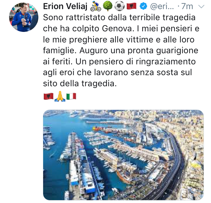 “Jam i pikëlluar nga tragjedia e tmerrshme që goditi Xhenovën. Mendimet dhe lutjet e mia për viktimat dhe familjet e tyre. Uroj një shërim të shpejtë të të plagosurve. Një falënderim për heronjtë që punojnë pa ndërprerje në vendin e tragjedisë”, shkruan Veliaj.