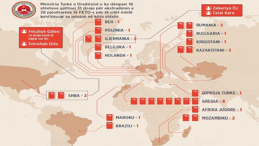 Ministria turke u ka dërguar 16 shteteve gjithsej 31 dosje për ekstradim të përgatitura nga prokuroritë dhe gjykatat për 28 pjesëtarë të Fetullah Gylen për të cilët është konfirmuar se jetojnë në këto shtete.