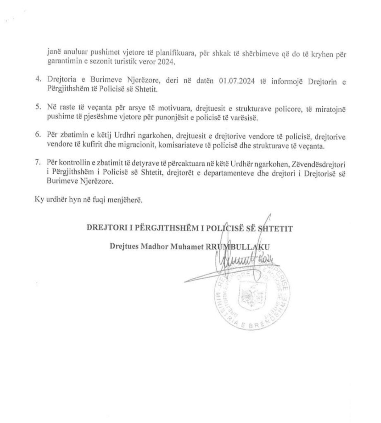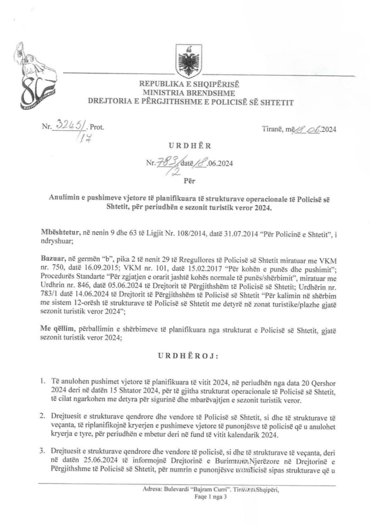 Duke nisur nga 20 qershor dhe deri në shtator, asnjë punonjës policie nuk do të bëjë pushime verore. Ky është urdhri i fundit i marrë nga Policia e Shtetit.