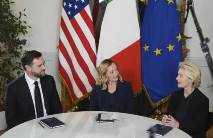 Nënpresidenti i SHBA-së, J.D. Vance, zhvilloi të dielën një takim të rëndësishëm në Romë me presidenten e Komisionit Evropian, Ursula von der Leyen, dhe kryeministren italiane Giorgia Meloni. Takimi, i mbajtur pas pjesëmarrjes së tyre në meshën e fronëzimit të Papës Leoni, u fokusua në mundësinë e rifillimit të bisedimeve tregtare ndërmjet Bashkimit Evropian dhe Shteteve të Bashkuara.
