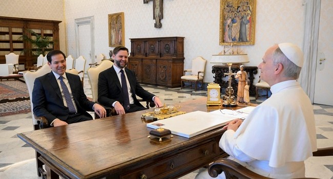 Zëvendëspresidenti i Shteteve të Bashkuara J.D. Vance dhe Sekretari i Shtetit Marco Rubio u pritën në Vatikan të hënën në mëngjes nga Papa Leo XIV , në një takim që u përqendrua në marrëdhëniet dypalëshe dhe bashkëpunimin midis Kishës dhe shtetit. Vance zhvilloi më pas bisedime me Kryepeshkopin Paul Richard Gallagher , Sekretarin e Vatikanit për Marrëdhëniet me Shtetet dhe Organizatat Ndërkombëtare .