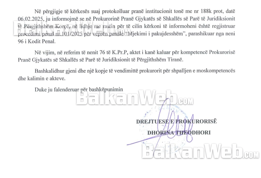 Megjithatë, Prokuroria e Korçës ka shpallur moskompetencën për hetimin e çështjes, pasi vdekja e 12-vjeçarit ka ndodhur në Qendrën Spitalore Universitare “Nënë Tereza” (QSUT) në Tiranë. Për këtë arsye, çështja do t’i kalojë Prokurorisë së Tiranës për hetime të mëtejshme.