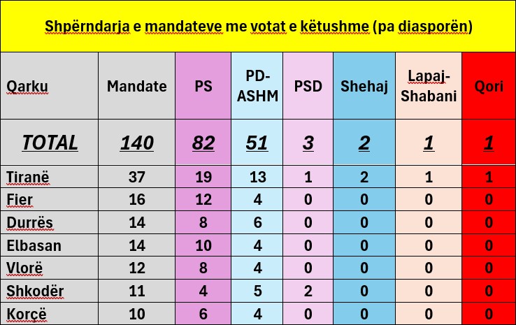 Shumë pritmëri e shumë debate ka patur për votat e diasporës, por 145 mijë prej tyre të numëruara deri tani, vetëm për 1 mandat kanë ndikuar – në Qarkun Vlorë. Në tabelën e mëposhtme mund të shihni sesi do të ishin ndarë mandatet pa votat e diasporës – pra vetëm me votat e zgjedhësve të këtushëm. Aty shihet se në këtë rast, PS-ja do të kishte 82 mandate, PD-ASHM 51, PSD 3, Lapaj-Shabani 1, Shehaj 2 dhe Qori 1.