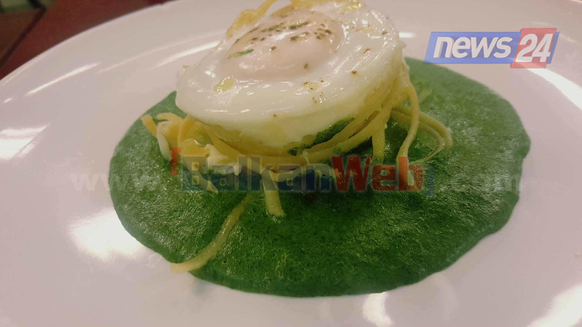 Shërbejmë recetën duke vendosur në një pjatë 2 lugë pure spinaqi dhe mbi të folenë me makarona dhe vezë.
