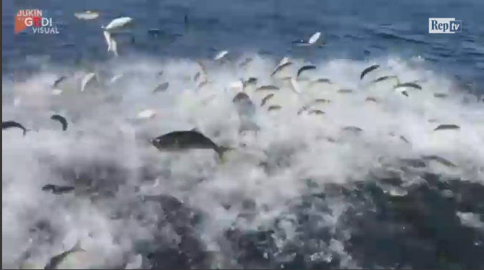 Nga deti i qetë fluturojnë qindra peshq dhe bashke me to edhe një balenë, duke u afruar vetëm pak centimetra nga barka.