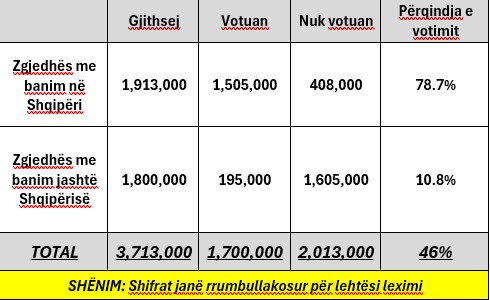 Përmbledhtazi, mund të thuhet se vetëm 1.75 milionë shtetas votuan, nga 3.71 milionë gjithsej në listat zgjedhore. Ose ndryshe mund të thuhet se votuan vetëm 46% e të gjithë shtetasve me të drejtë vote (brenda e jashtë vendit).