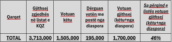 Duke ndërthurur shifrat e mësipërme, rezulton se rreth 408 mijë zgjedhës të këtushëm nuk votuan. Ose ndryshe mund të thuhet se votuan rreth 79% e zgjedhësve të këtushëm. Nga ana tjetër, mbi 1.6 milionë zgjedhës të diasporës nuk votuan. Ose mund të thuhet se votuan vetëm 10.8% zgjedhësve në diasporë.