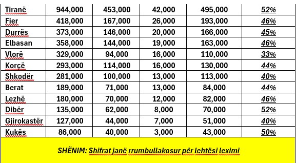 Në dy tabelat e mëposhtme janë të përmbledhura shifrat e mësipërme si edhe ato në nivel qarku.