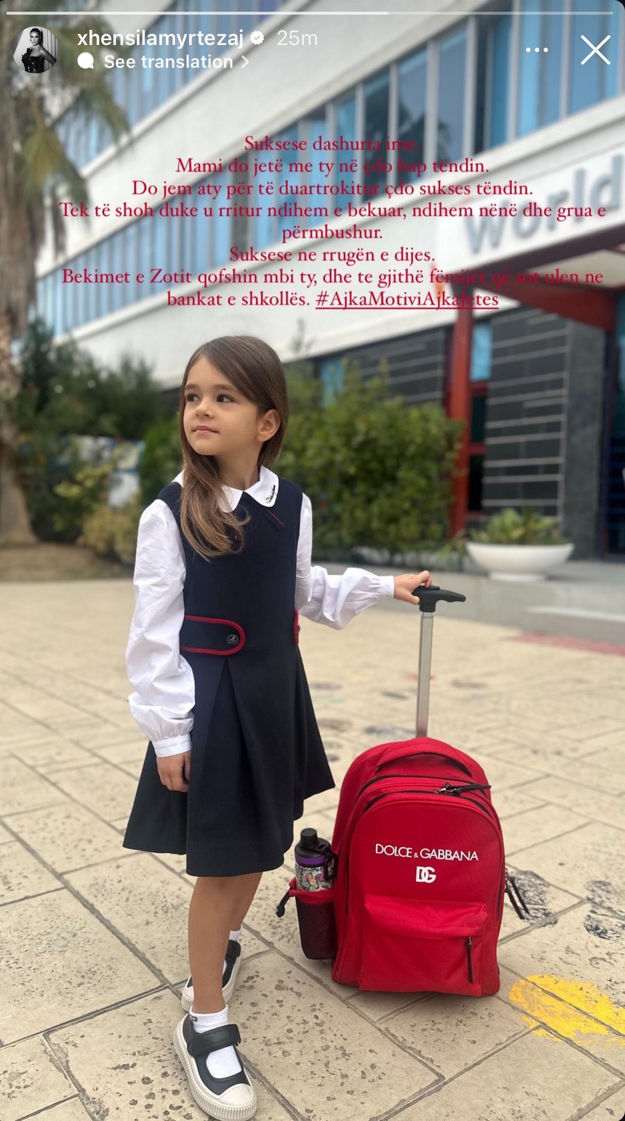 Por nuk ishte vetëm urimi që na tërhoqi vëmendjen. Në fotografinë që Xhensila postoi, Ajka shfaqet me një çantë shkolle të markës luksoze Dolce & Gabbana.