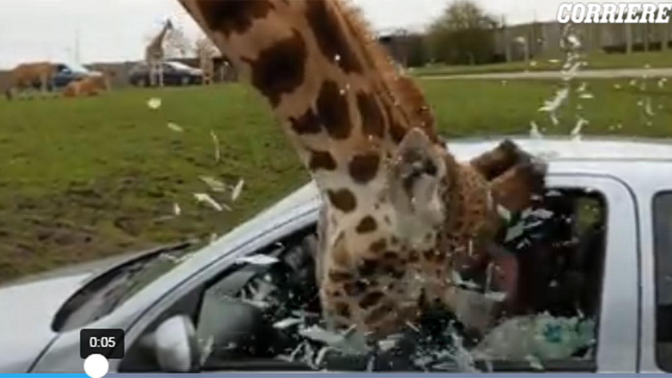 Një xhirafë ka futur kokën në një makinë për të marrë ushqim, por më pas dritarja bëhet në një mijë copa.