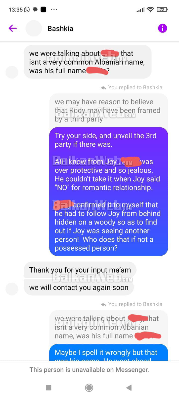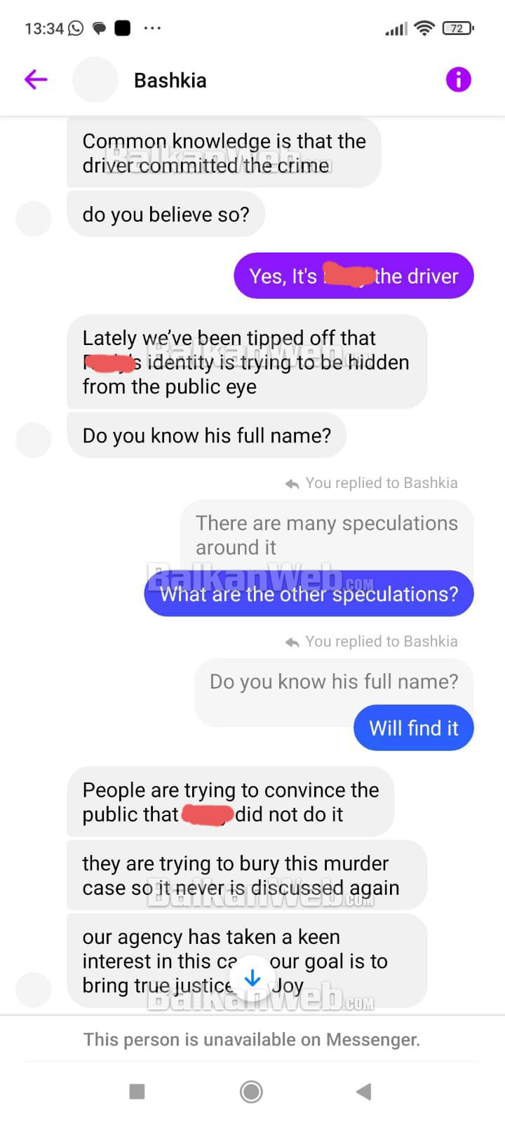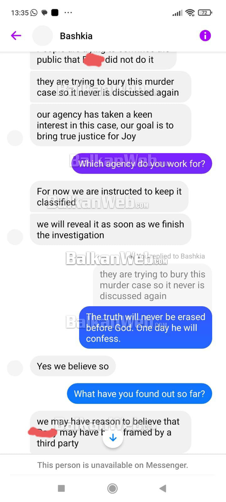 Më pas adresa anonime i shkruan se “shoferi mund të jetë shtyrë edhe nga persona të tretë”, dikush që ka njohur qëllimet e tij ndaj Xhoit. Në fund i thotë që do përpiqen të konfirmojnë teorinë e tyre sa më shpejt lidhur me të vërtetën. Nëna e vajzës nuk i beson për identitetin dhe qëllimin dhe mundohet ta marrë me video kamera këtë adresë, por kjo adresë ia bllokon telefonatën dhe mbyllet farë si account në Facebook.