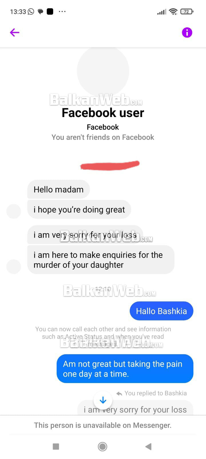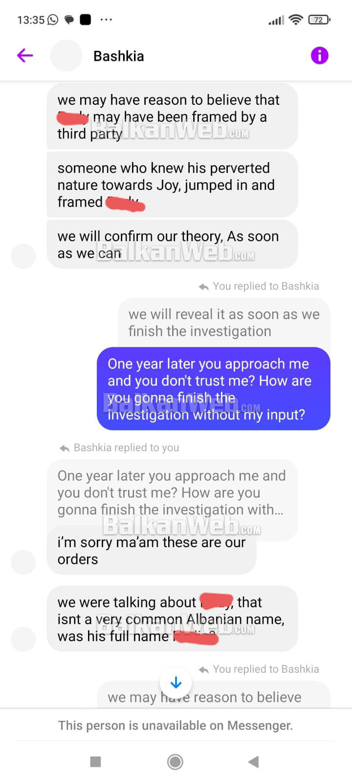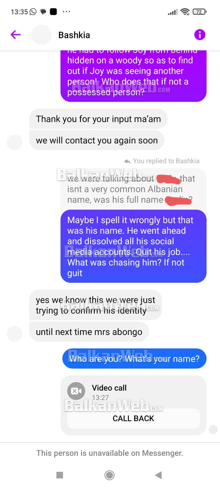 Më pas adresa anonime i shkruan se “shoferi mund të jetë shtyrë edhe nga persona të tretë”, dikush që ka njohur qëllimet e tij ndaj Xhoit. Në fund i thotë që do përpiqen të konfirmojnë teorinë e tyre sa më shpejt lidhur me të vërtetën. Nëna e vajzës nuk i beson për identitetin dhe qëllimin dhe mundohet ta marrë me video kamera këtë adresë, por kjo adresë ia bllokon telefonatën dhe mbyllet farë si account në Facebook.