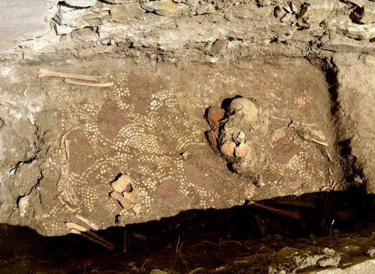 “Gjatë proçesit të gërmimit të shpëtimit, gjatë pastrimit të mbetjeve skeletore njerëzore, nën të, doli në pah pjesë e një mozaiku polikrom, (shumë ngjyrësh) që mendohet të ketë zbukuruar dyshemenë e një ndërtese të periudhës së antikitetit të vonë. Materialet e ndërtimit, teknika e realizimit të mozaikut, si dhe elementë të tjerë sugjerojnë, se ky mozaik zbukuron dyshemenë e një vepre ndërtimore ndoshta të shek. V-VI,” tha Çoku”.