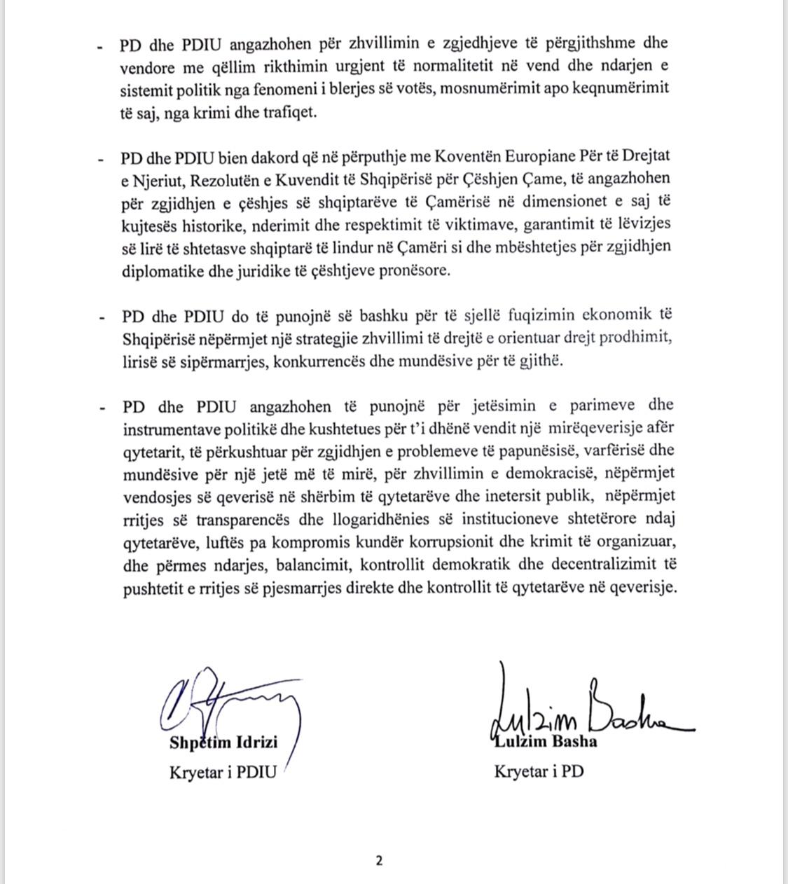TIRANE- Zgjerimi i Frontit të Bashkuar Opozitar me PDIU është konkretizuar me një marrëveshje mes Kryetarit të PD Lulzim Basha dhe Kryetarit të PDIU, Shpëtim Idrizi. “BalkanWeb” ka zbuluar marrëveshjen me 6 pika Basha-Idrizi, pas takimit që është zhvilluar sot mes tyre.