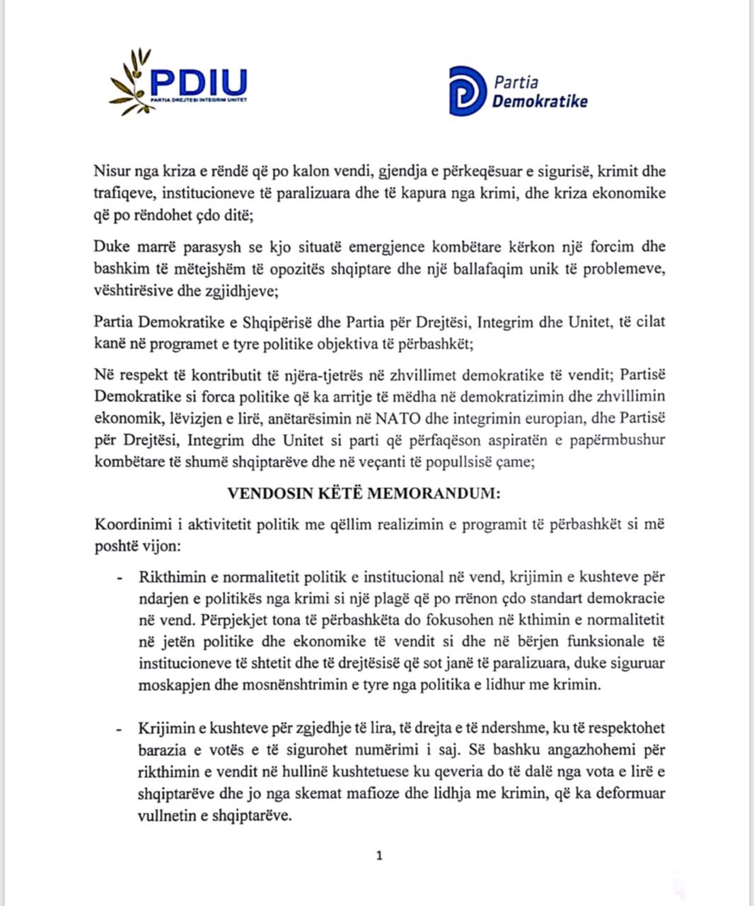 Mësohet se PD dhe PDIU janë angazhuar së bashku për një qeverisje të çliruar nga krimi.