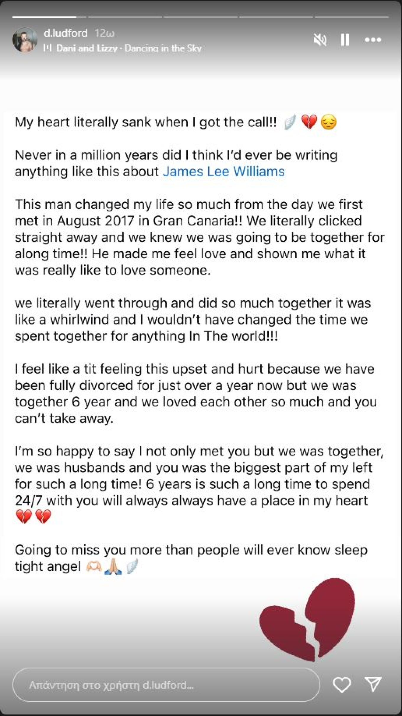 “Zemra ime u thye kur mora një telefonatë. Asnjëherë në një milion vjet nuk mendoja se do të shkruaja diçka të tillë për James Lee Williams. Ky burrë ma ndryshoi jetën kaq shumë që nga dita kur u takuam për herë të parë në gusht 2017 në Gran Canaria! Që në fillim e dinim se do të ishim bashkë për një kohë të gjatë! Më bëri të ndihesha i dashuruar dhe më tregoi se si është të duash dikë. Kaluam dhe bëmë kaq shumë bashkë, ishte si një vorbull dhe nuk do ta ndërroja kohën që kaluam së bashku me asgjë në botë! Ne ishim bashkë për 6 vjet dhe e donim shumë njëri-tjetrin. Jam shumë i lumtur jo vetëm që të takova, por edhe që ishim bashkë, si burrë e grua dhe ti ishe pjesa më e madhe e jetës sime për një kohë kaq të gjatë. 6 vjet është një kohë kaq e gjatë për të kaluar 24 orë në ditë së bashku. Do të kesh gjithmonë një vend në zemrën time. Do të më mungosh më shumë se sa njerëzit do ta kuptojnë ndonjëherë. “Pusho, engjëlli im.”