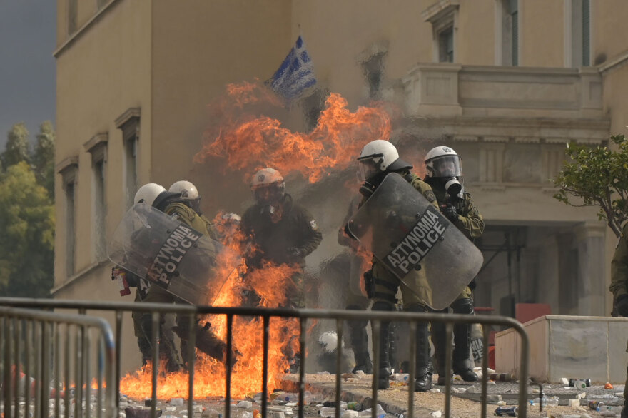 Persona me kapuçë në kokë kanë hedhur në drejtim të efektivëve të policisë gurë ndërsa me urdhër të kryetares së Kuvendit, në godinë për t’u mbrojtur kanë hyrë edhe qytetarë të thjeshtë që ndodheshin në vendngjarje në sheshin Sintagma ose ndjenin shqetësime nga gazi lotsjellës që u hodh në drejtim të protestuesve.