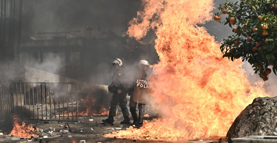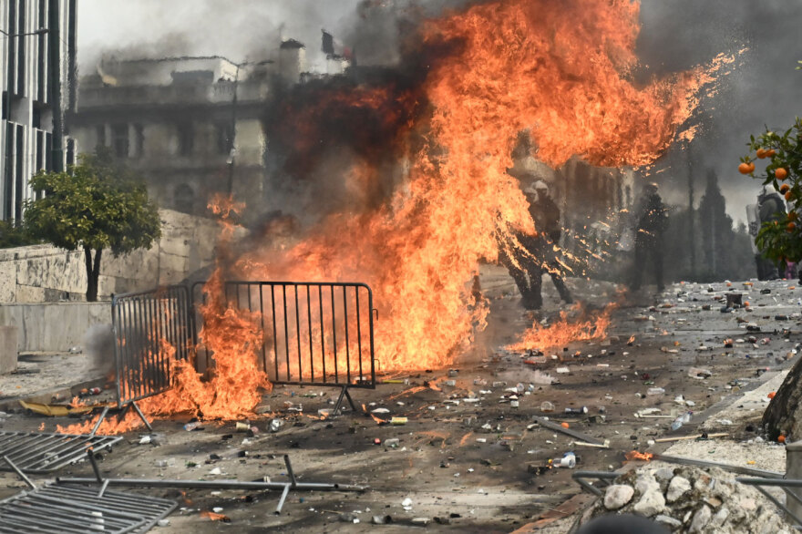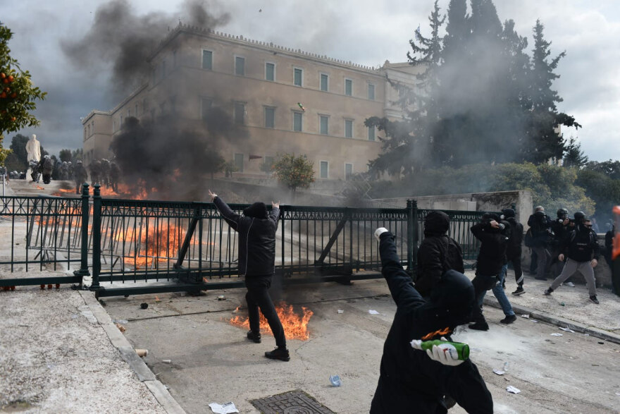 The center of Athens is now on fire. Anarchists deliberately destroyed one of the largest and largely non-partisan protests in the history of Greece, throwing rocks and molotov cocktails next to families with children, who were forced to run chaotically in all directions. pic.twitter.com/v35ROeEE2x
